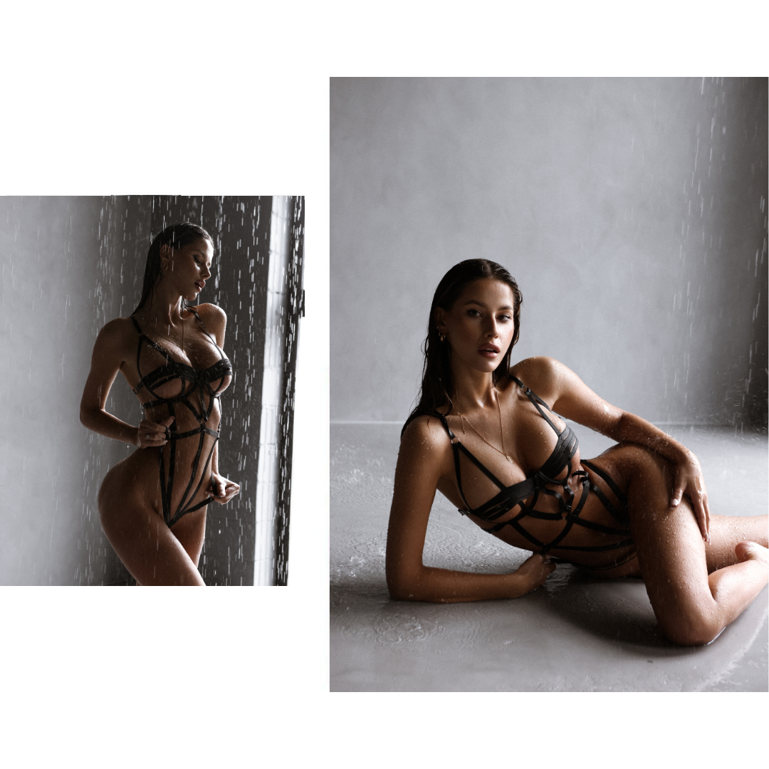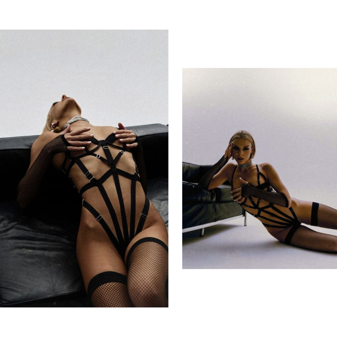 The CENSURE bodysuit is an exceptional creation, entirely designed with high-quality straps. Its unique and bold design highlights the skin with strategic openings, creating a seductive visual effect that draws all eyes. It is a true work of art in the field of lingerie.